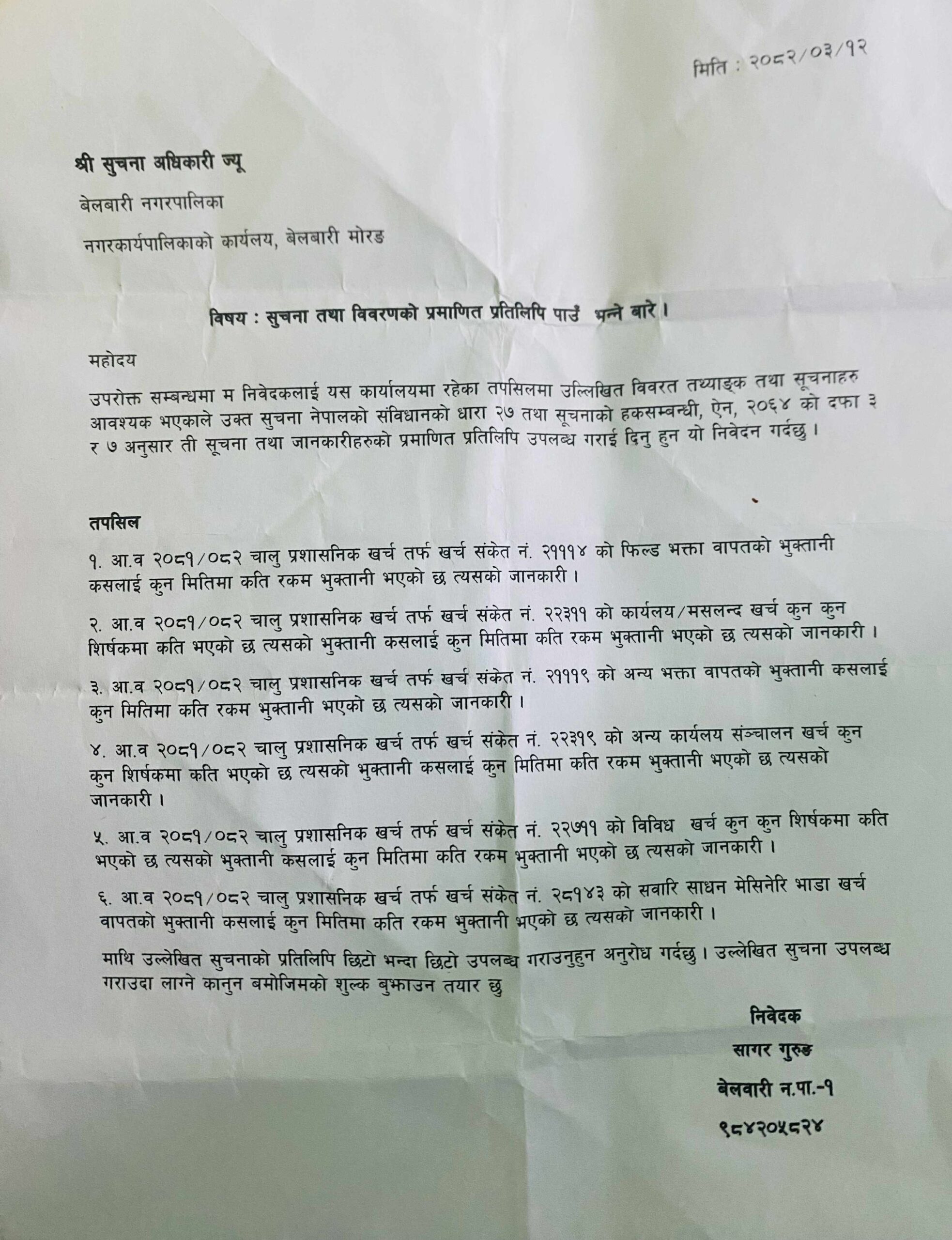 उपप्रमुख थापाले नगरपालिकाबाट प्रचलनमा रहेका विभिन्न शीर्षकका खर्च विवरण नपाएको गुनासो गर्दै स्थानियले ६ बुँदे मागपत्र पेश गरेका छन् । तीमध्ये साना रकम पनि (५० हजार वा एक लाख माथिका) भुक्तानी अघि उपप्रमुखबाट स्वीकृति लिनुपर्ने, छात्रवृत्ति तथा प्रोत्साहन भत्ता लगायत व्यक्तिगत खर्च विवरण समेत हेर्न पाउनु पर्ने माग उपप्रमुखको रहेको छ ।