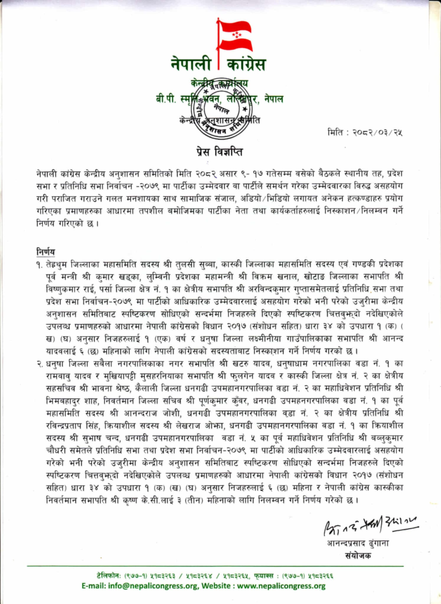 पार्टीको अनुशासन समितिले लुम्बिनीका महामन्त्री विक्रम खनाल, खोटाङका जिल्ला सभापति विष्णुकुमार राई र कास्कीका निवर्तमान सभापति कृष्ण केसी लगायत १८ नेताहरूमाथि एक वर्षदेखि तीन महिनासम्मको निष्कासनको निर्णय सार्वजनिक गरेको थियो। यी नेताहरू सबैजसो शेखर कोइराला समूहमा सक्रिय रहेका छन्।