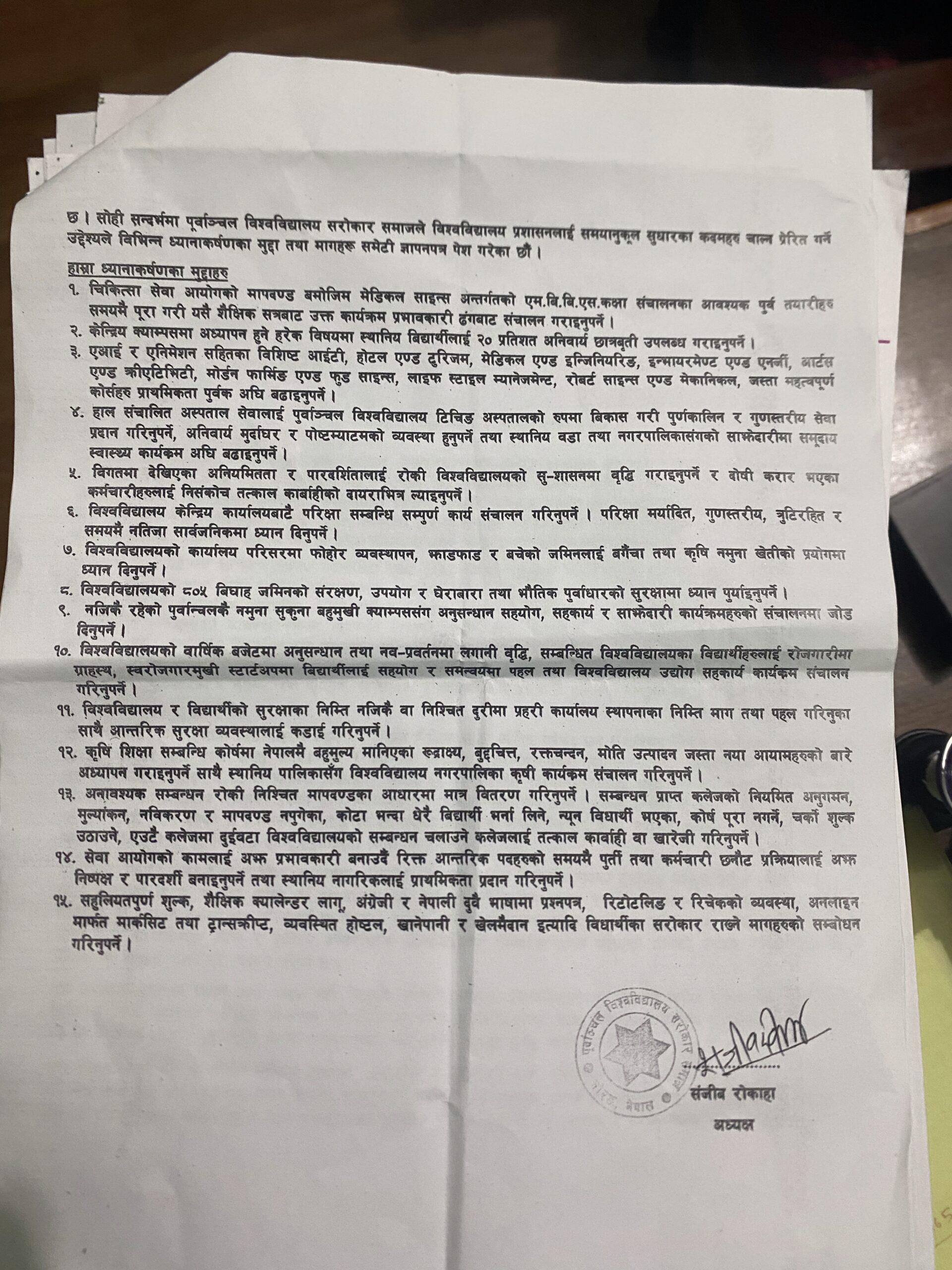 ज्ञापनपत्रमा शैक्षिक गुणस्तरमा गिरावट, ढिलासुस्तीपूर्ण प्रशासनिक प्रक्रिया, परीक्षा व्यवस्थापनमा देखिएको अव्यवस्था र सम्बन्धनप्राप्त कलेजहरूको नियमनमा कमजोरी देखिएकोप्रति गम्भीर आपत्ति जनाइएको छ। समाजले विश्वविद्यालयलाई पारदर्शी, विद्यार्थीमैत्री र अनुसन्धानमुखी बनाउन दीर्घकालीन रणनीति आवश्यक रहेको उल्लेख गरेको छ।