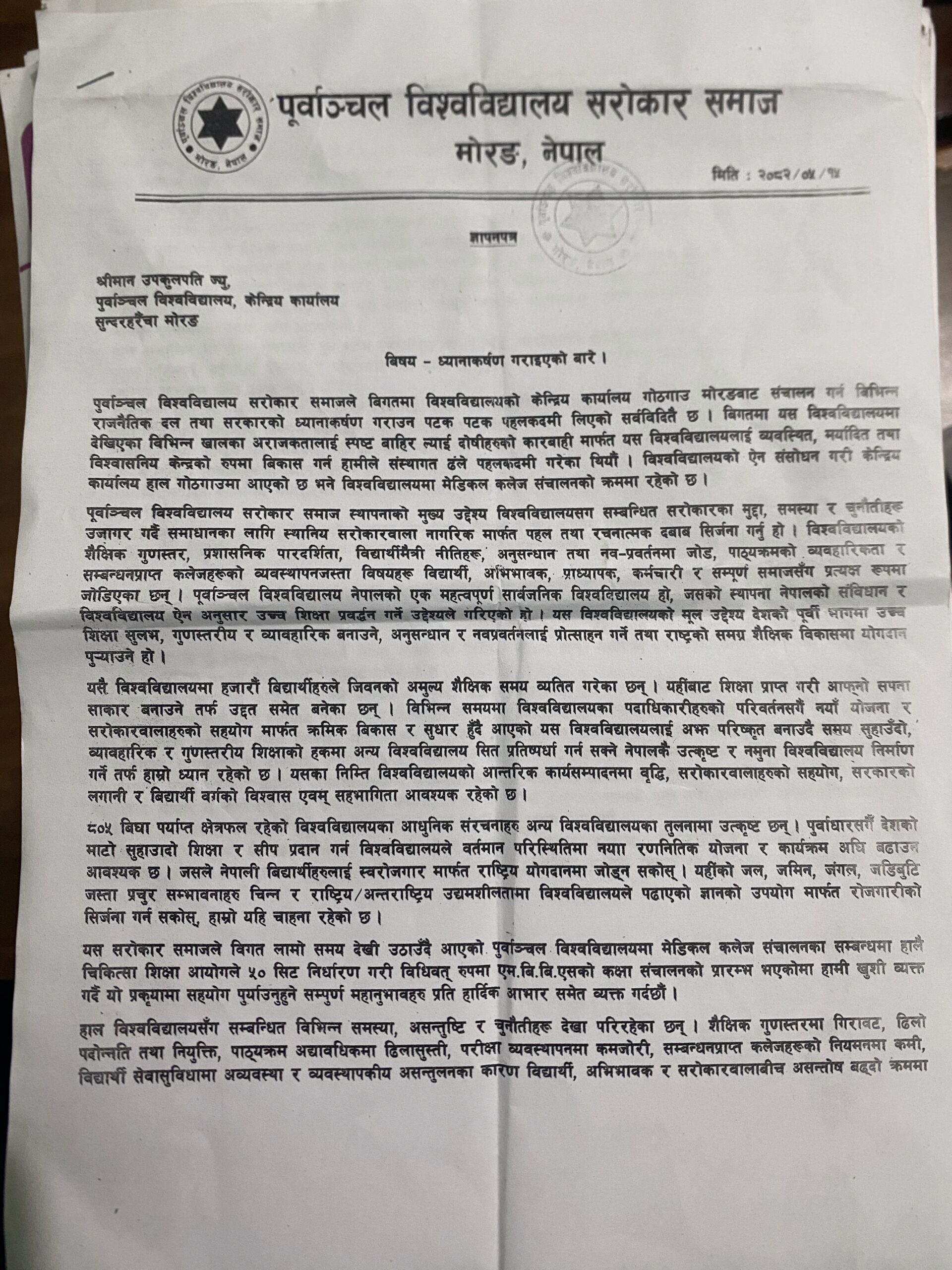 मोरङ । पूर्वाञ्चल विश्वविद्यालय सरोकार समाजले विश्वविद्यालयमा देखिएका अव्यवस्था, कमजोरी र चुनौतीप्रति गम्भीर ध्यानाकर्षण गराउँदै तत्काल सुधारका लागि ठोस कदम चाल्न आग्रह गरेको छ। शुक्रवार समाजका प्रतिनिधिहरूले सुन्दरहरैँचास्थित विश्वविद्यालयको केन्द्रीय कार्यालय पुगेर कुलपति समक्ष ज्ञापनपत्र बुझाएका हुन्।