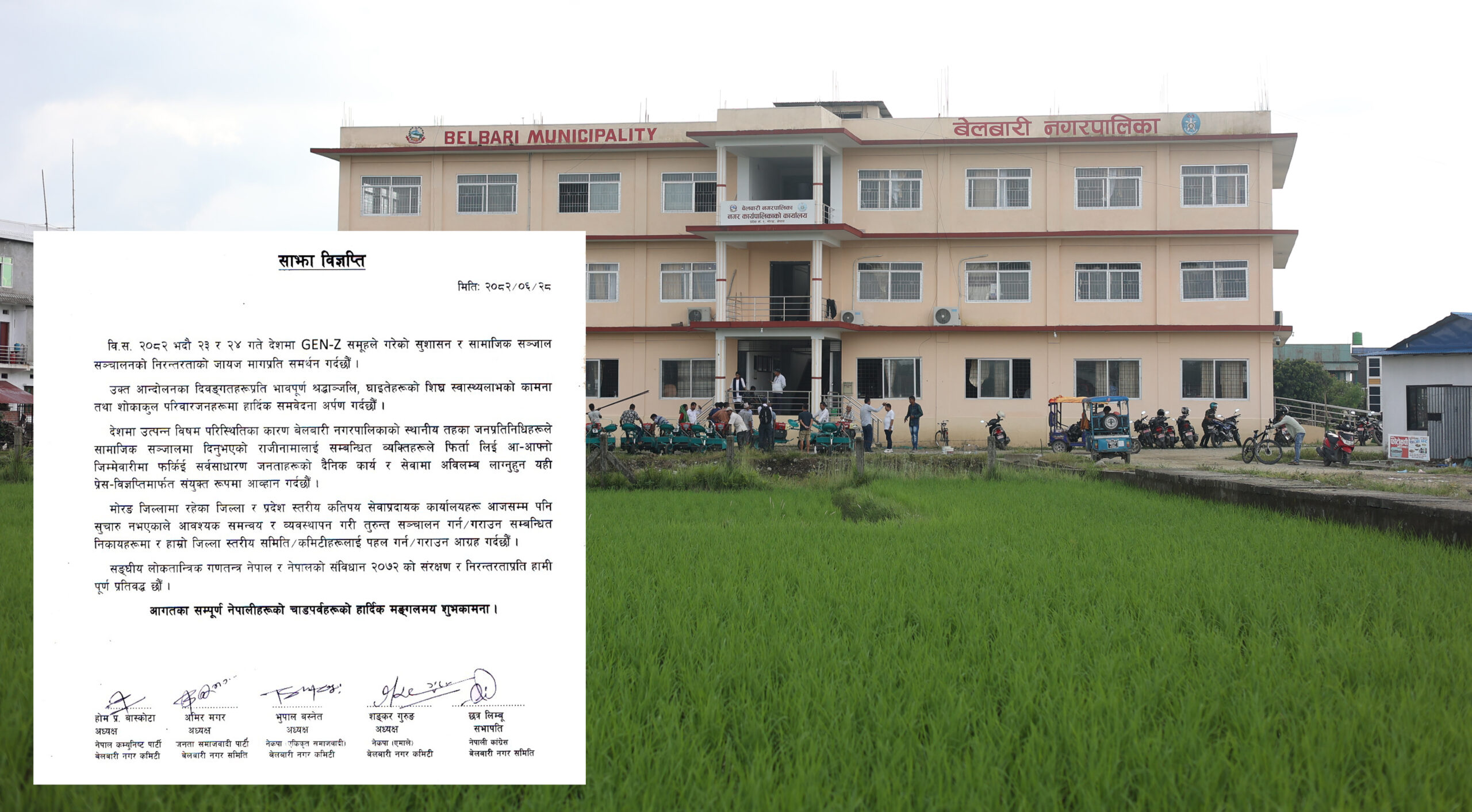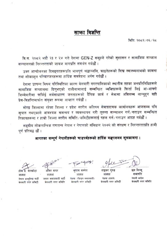 बेलबारी, मोरङ । सुशासन र सामाजिक सञ्जाल सञ्चालनको निरन्तरता माग गर्दै जेनजी समूहले भदौ २३ र २४ गते देशभर सञ्चालन गरेको आन्दोलनप्रति बेलबारीमा पाच दलले संयुक्त रूपमा समर्थन जनाएको छ । आन्दोलनका क्रममा दिवङ्गत भएकाप्रति श्रद्धाञ्जली अर्पण गर्दै घाइतेहरूको शीघ्र स्वास्थ्यलाभको कामना गरेका छन् ।