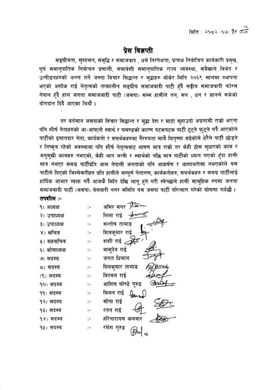 मोरङ । जनता समाजवादी पार्टी (जसपा) बेलबारी नगर समितिका सम्पूर्ण पदाधिकारी र सदस्यहरूले पार्टी परित्याग गरेका छन् । आइतबार मिति २०८२ साल कार्तिक १९ गते जारी विज्ञप्तिमार्फत उनीहरूले सामूहिक रूपमा पार्टी परित्यागको घोषणा गरेका हुन् ।