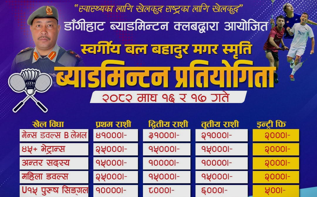 बेलबारी । “स्वास्थ्यका लागि खेलकुद, राष्ट्रका लागि खेलकुद” भन्ने मूल नारालाई आत्मसात् गर्दै डाँगीहाट ब्याडमिन्टन क्लबको आयोजनामा स्वर्गीय बल बहादुर मगरको स्मृतिमा ब्याडमिन्टन प्रतियोगिता हुने भएको छ । मोरङको बेलबारी नगरपालिका-११, लक्ष्मीमार्गस्थित डाँगीहाट क्षेत्रमा आगामी २०८२ माघ १६ र १७ गते दुई दिनसम्म प्रतियोगिता सञ्चालन हुने आयोजकले जनाएको छ ।