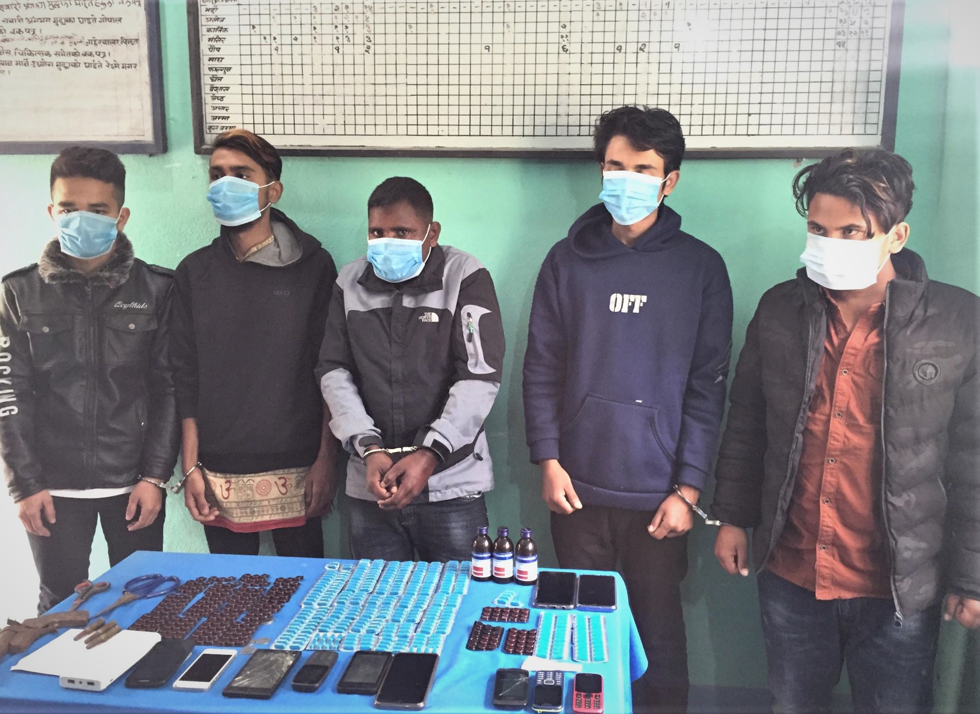 डिएसपी गिरीका अनुसार लागुऔषध नाइट्राभेट ३० ट्याब्लेट, कोरेक्स तीन बोतल, स्पास्पोक्रेन प्लस ४८ ट्याब्लेट र विभिन्न कम्पनीका छ वटा मोबाइल सेट फेला परेको छ । पक्राउ परेकाले डाइनियाका मोहम्मद मुस्ताफले आफूहरूलाई लागुऔषध बिक्री गरेको बताएपछि प्रहरीले डाइनिया पुगेर राति नै मुस्ताफलाई पनि पक्राउ गरेको हो ।