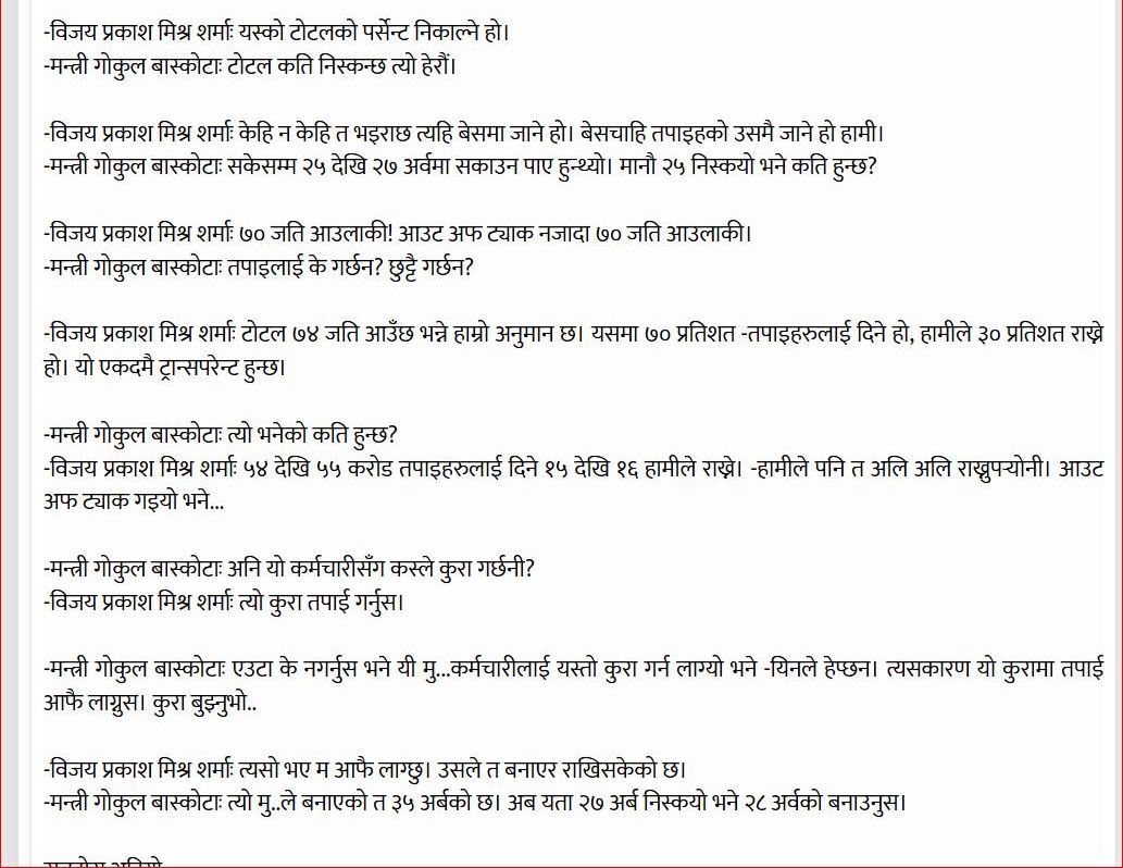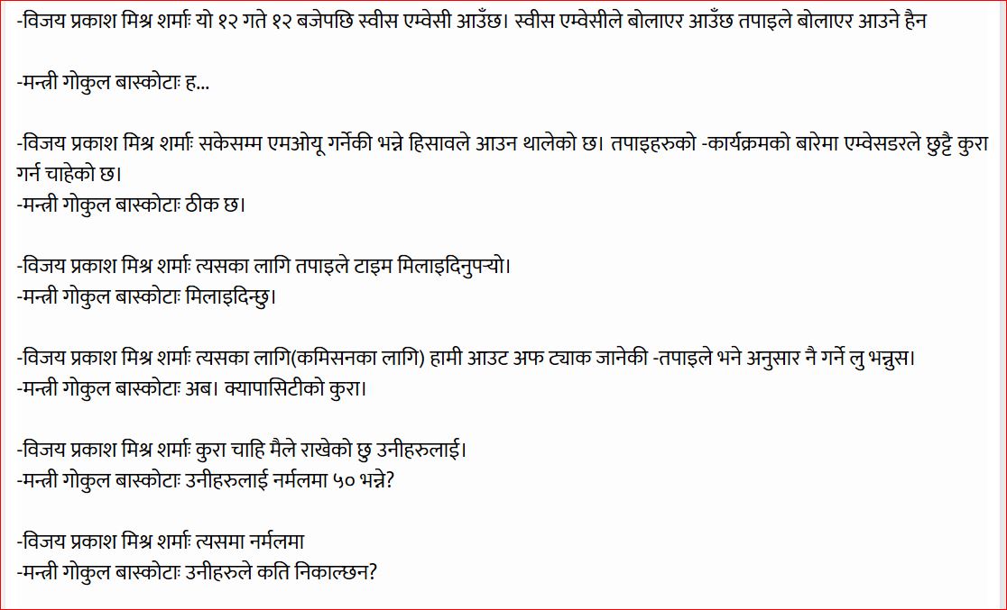 सार्वजनिक भएको अडियो टेपमा मन्त्री बाँस्कोटाले प्रस्तावित सेक्युरिटी प्रेस स्थापना गर्ने सम्झौता २० देखि २७ अर्बमा सक्न एजेन्ट शर्मालाई भनेको सुनिन्छ।