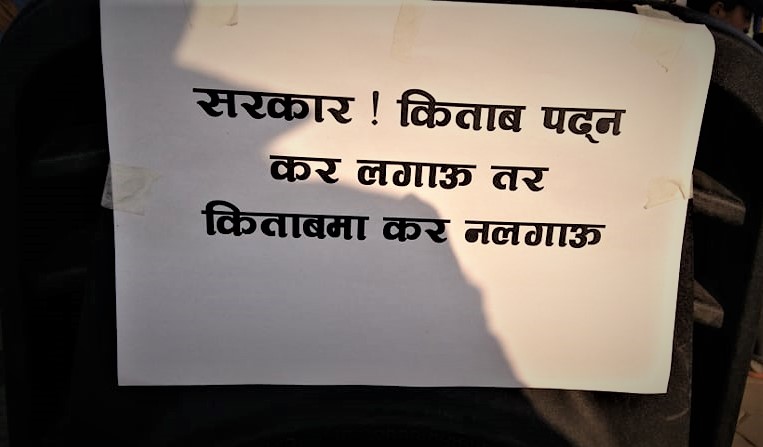 दमक, ११ फागुन । दमकका युवा अगुवाहरूले किताबमा १० प्रतिशत कर लगाउने सरकारी निर्णय विरुद्ध दमक चौकमा आइतबारबाट प्रदर्शन सुरु गरेको छ ।