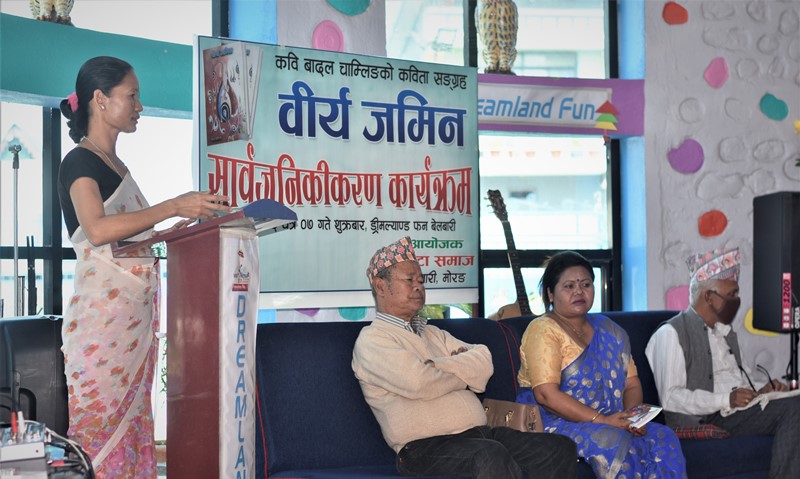बेलबारी ३ मा रहेको ड्रिमल्याण्ड फन पार्कको सभाहलमा शुक्रवार आयोजित कार्यक्रममा बेलबारी नगरपालिकाका उपप्रमुख एवम् स्रष्टा ढाकाकुमारी पराजुली, स्रष्टा समाज बेलबारीका अध्यक्ष हर्कमान तामाङ, भाषाविद् एवम् स्रष्टा आचार्य “अ” ले संयुक्त रूपमा कविता कृतिको विमोचन गरेका थिए ।