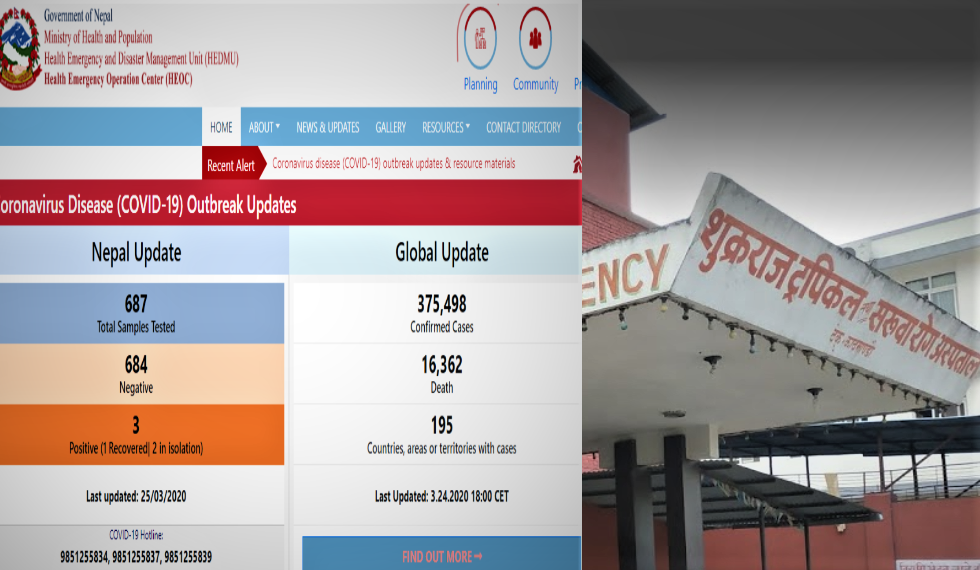 काठमाडौँ, १२ चैत । नेपालमा कोरोना भाइरस (कोभिड-१९) को सङ्क्रमित सङ्ख्या तिन पुगेको छ । टेकुस्थित शुक्रराज ट्रपिकल अस्पतालले पठाएको एक व्यक्तिको नमुनामा पोजेटिभ देखिएको छ ।