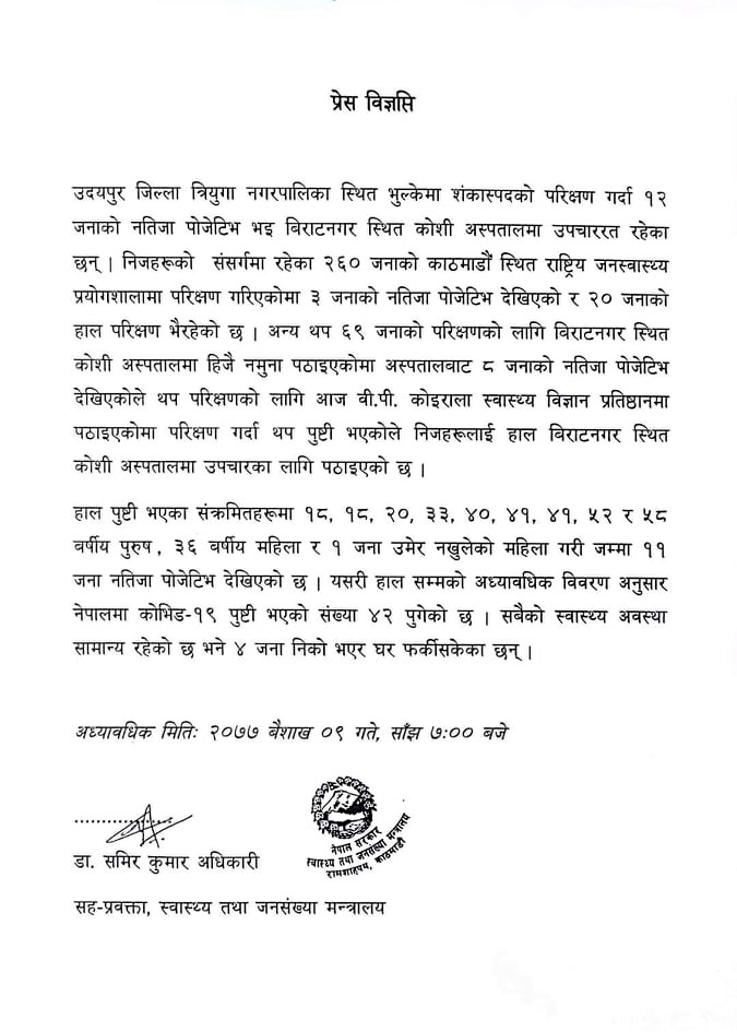 अन्य थप ६९ जनाको परीक्षणको लागि विराटनगर स्थित कोसी अस्पतालमा हिजै नमुना पठाइएकोमा अस्पतालबाट ८ जनाको नतिजा पोजेटिभ देखिएकोले थप परीक्षणको लागि आज वि.पी कोइराला स्वास्थ्य विज्ञान प्रतिष्ठानमा पठाइएकोमा परीक्षण गर्दा थप पुष्टि भएकोले उनीहरूलाई हाल कोसी अस्पतालमा नै उपचारको लागि पठाइएको मन्त्रालयले विज्ञप्ति मार्फत जनाएको छ ।