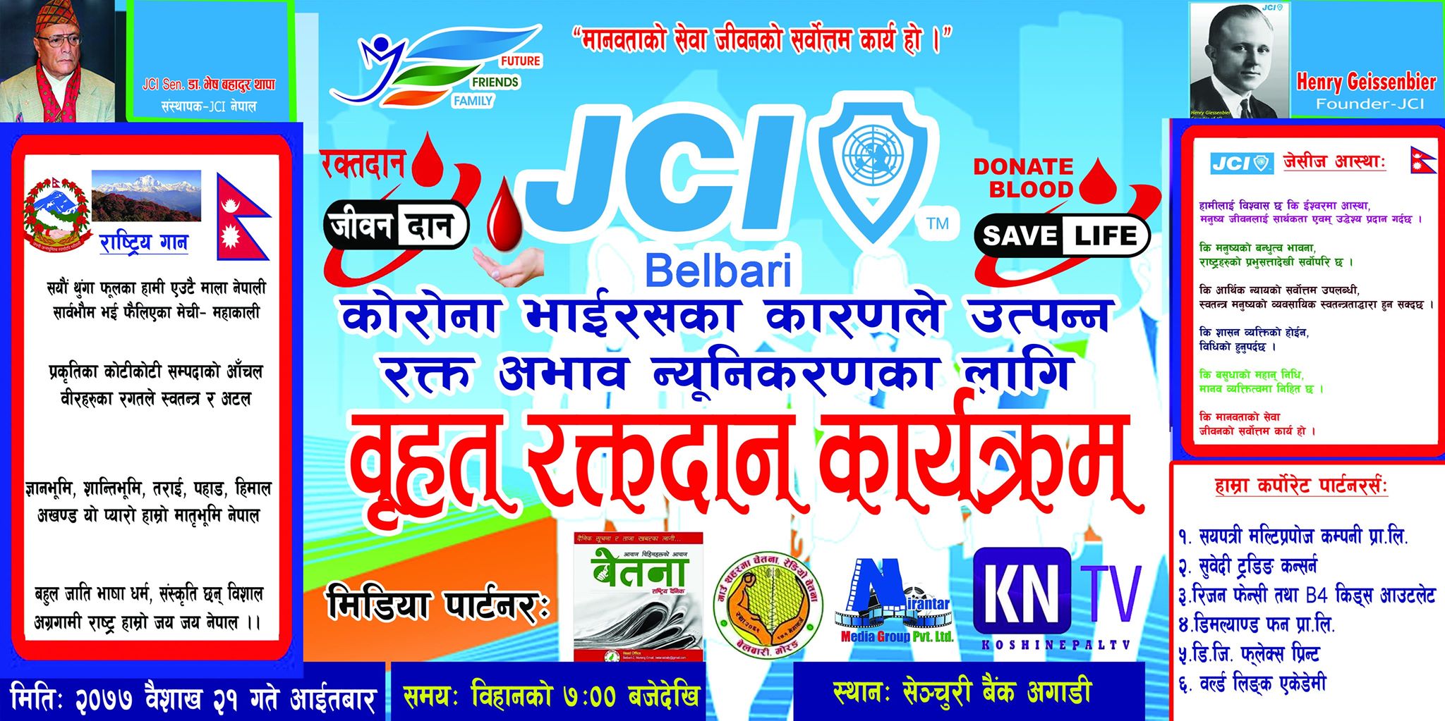 बेलबारी जेसीजका अध्यक्ष राजेश खत्रीले लकडाउनमा उत्पन्न भएको रक्त अभावलाई न्यूनीकरण गर्ने उद्देश्यले वैशाख २१ गते बेलबारी वाड नं. ३ स्थित सेन्चुरी बैङ्क अगाडी बिहान ७ बजे देखी रक्तदान कार्यक्रम गर्ने जनाएका छन् ।