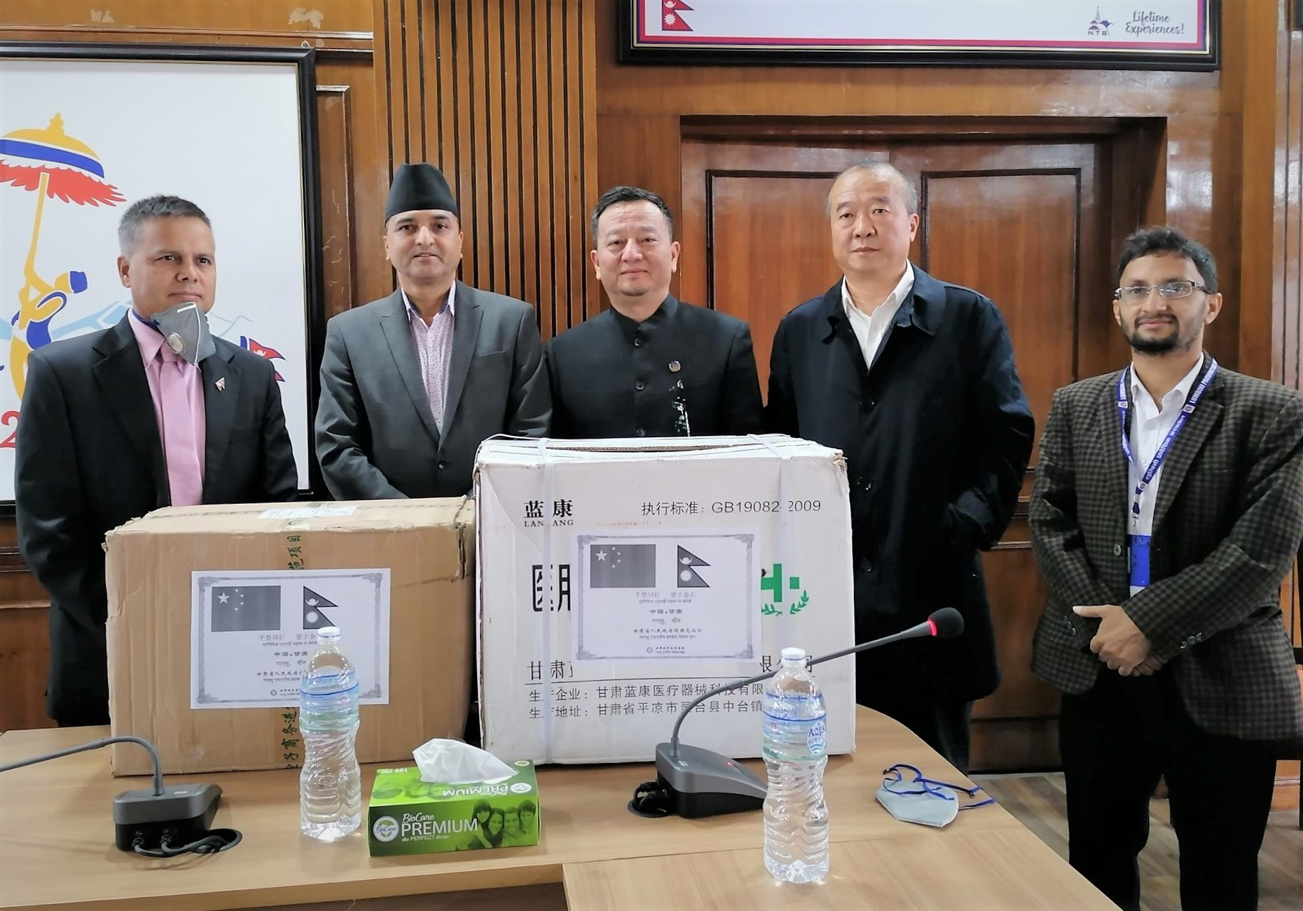संस्कृति, पर्यटन तथा नागरिक उड्डयन मन्त्री योगेश भट्टराई तथा मन्त्रालयका सचिव केदारवावु अधिकारीलाई गान्सु प्रान्त सरकार प्रतिनिधि होङ्ग होङ्गले २० हजार थान सर्जिकल मास्क र एक हजार थान पिपिई हस्तान्तरण गरेका छन् ।