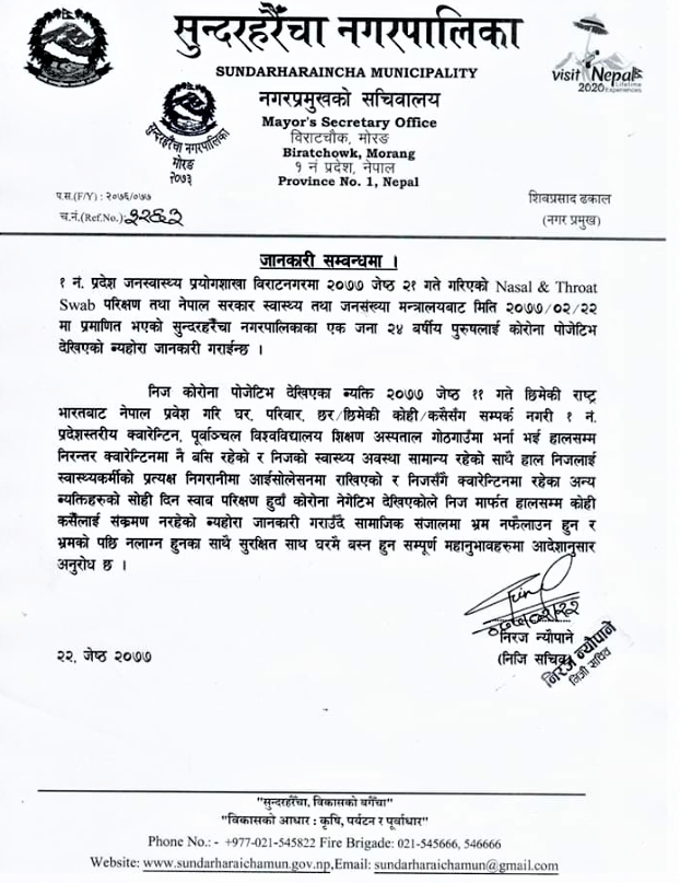 प्रदेश जनस्वास्थ्य प्रयोगशाला विराटनगरमा परीक्षण गर्दा सुन्दरहरैंचा नगरपालिकाका एक जना पुरुषमा कोरोना संक्रमण देखिएको हो । उनी भारतबाट आएर क्वारेनटाइनमा बसेका व्यक्ति हुन् ।उनी सुन्दरहरैंचाको वडा नम्बर १ निवासी २४ वर्षीय पुरुष भएको बताइएको छ ।