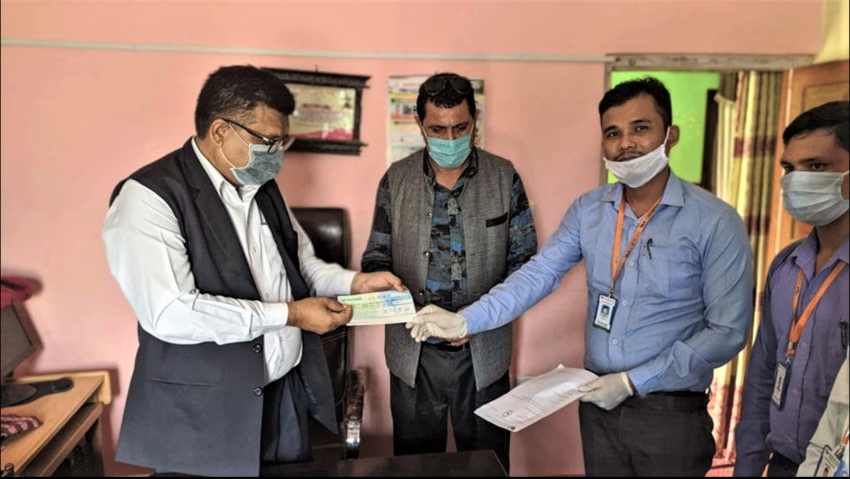नगरको कार्यवाहक प्रमुख प्रशासकीय अधिकृत राजेन्द्र भट्टराईको उपस्थितिमा वडा नं ८ का वडाध्यक्ष नन्द प्रसाद चौलागाईलाई शाखा प्रबन्धक हेम नारायण माझीले चेक हस्तान्तरण गरेका छन् । यस शाखा मार्फत सामाजिक उत्तरदायित्व बहन गर्दै कोरोना विरुद्धको लडाइमा ऐक्यबद्धता जनाउन पाएकोमा खुसी लागेको माझीले बताए ।