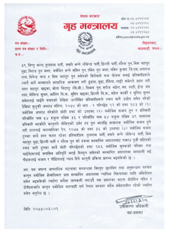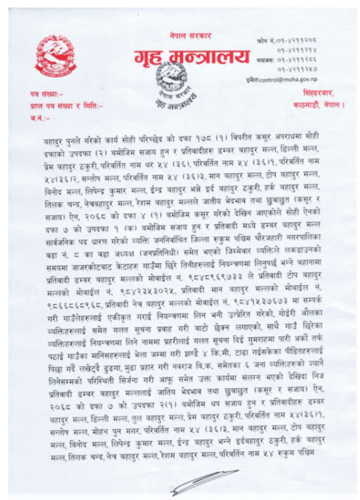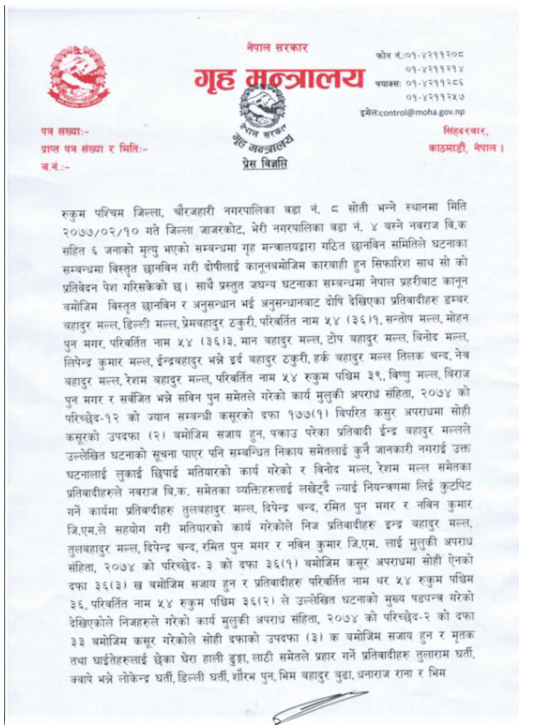 वडाध्यक्ष मल्लसहित ३४ प्रतिवादीविरुद्ध जिल्ला अदालत, रुकुममा कर्तव्य ज्यान, ज्यान मार्ने उद्योग र जातीय भेदभाव तथा छुवाछुत ऐन अनुसार कारबाहीका लागि मुद्दा दर्ता भएको छ ।