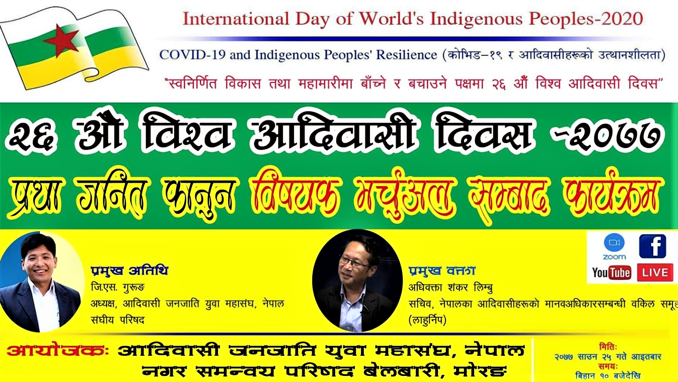 कार्यक्रमका प्रमुख वक्ता रहनु भएका नेपालका आदिवासी जनजातिहरूको मानवअधिकार सम्बन्धी वकिलहरूको समूह (लाहुर्निप) का सचिव शंकर लिम्बुले नेपालमा अहिले पनि आदिवासी समुदायको ठुलो हिस्सा प्रथाजनित कानुनबाट प्रशासित रहेको बत्ताउनुभयो । थकाली, थारु, सन्थाल, नेवा: समुदायको प्रथाजनित कानुन सशक्त रहेको बताउँदै राज्यको कानुनलाई समेत उनीहरूको प्रथाजनित कानुनले चुनौती दिइरहेको बत्ताउनुभयो । प्रथा जनित कानुन भनेको अलिखित कानुन भएको बताउनु हुँदै यसलाई आदिवासी समुदायले हजाराै वर्ष देखि अभ्यास गरिरहेको बत्ताउनुभयो । उहाँले नेपालको संविधान नश्लिय संविधान भएको समेत बत्ताउनुभयो, यो संविधान परिवर्तन गरिनु पर्ने आवश्यकता समेत ओैल्याउनु भयो ।