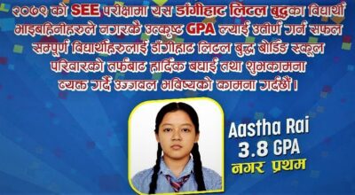 बेलबारी । बेलबारी नगरपालिका वडा नं.९ की आस्था राईले एसइई परीक्षामा उत्कृष्ट जिपिए ल्याएकी छिन । डाँगीहाट लिटल बुद्ध बोर्डिङ