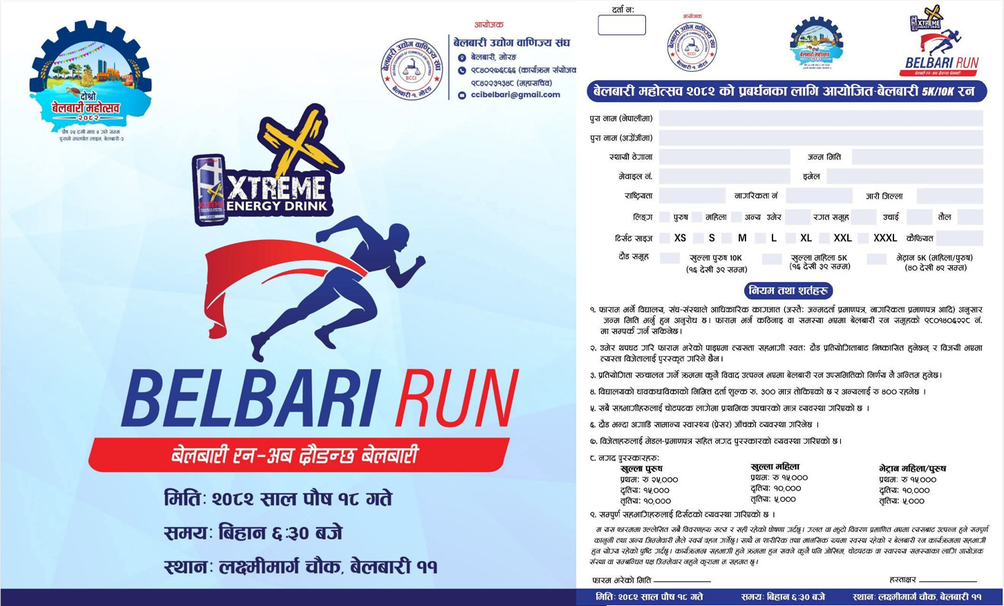 मोरङ । बेलबारी महोत्सव २०८२ को प्रवर्द्धन गर्ने उद्देश्यले मोरङको बेलबारीमा बेलबारी ५ तथा १० किलोमिटर दौड प्रतियोगिता हुने भएको छ । बेलबारी उद्योग वाणिज्य संघको आयोजनामा हुन लागेको उक्त दौड प्रतियोगिता पुस १८ गते