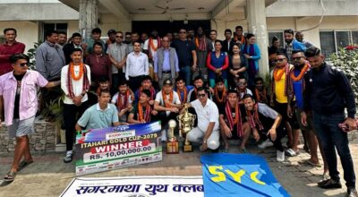 सुन्दरहरैँचा । सुन्दहरैँचा नगरपालिकाले सगरमाथा यूथ क्लब तथा खेलाडीलाई सम्मान तथा बधाई ज्ञापन गरेको छ । शनिवार सम्पन्न इटहरी गोल्डकपको